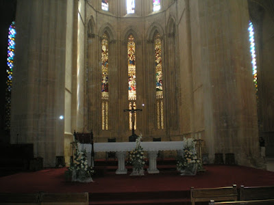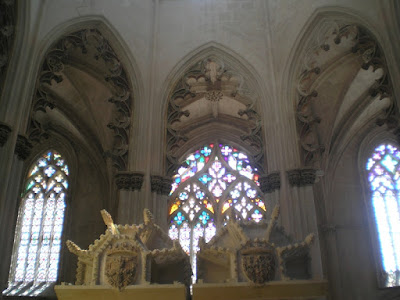Túmulos do Rei D. João I e da Rainha Filipa de Lencastre ou Lancaster, tendo como pano de fundo os vitrais e os arcos em ogiva.